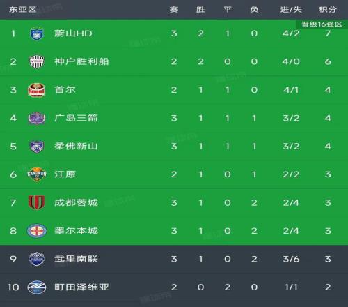 亚冠精英联赛最新积分榜