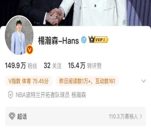从选秀当天至今,杨瀚森的个人账号@楊瀚森-Hans在微博涨粉超100万,相关超话聚集球迷近97万人。而杨瀚森所在的开拓者队@波特兰开拓者,粉丝数也增长了近80万。@杨瀚森工作室 今年8月开通微博账号,仅2个月时间,粉丝数已增长到33.6万。