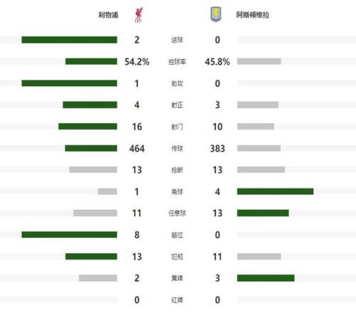 下半场第58分钟,攻势不减的利物浦扩大领先优势,近期状态神勇的赫拉芬贝赫大禁区前沿的远射,打在防守球员身上折射入网,帮助利物浦把领先的优势扩大到了2球,完全掌握住了获胜的主动权。 没有放弃的维拉,第70分钟形成反击,但马伦的打门稍稍偏出,没有能够命中目标,余下的时间,利物浦明显开始控制节奏,虽然没能够进一步扩大领先,但防守端也没有给维拉任何机会,如愿零封获胜。