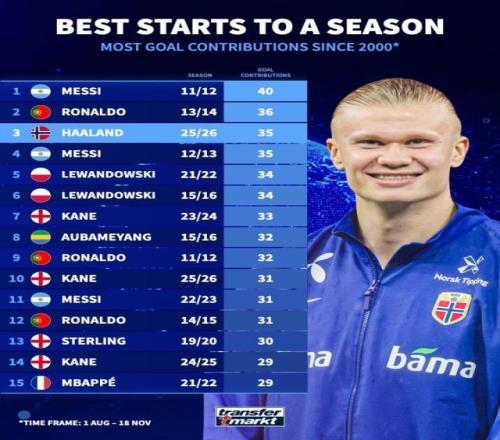 11月20日宣 德转统计了本世纪赛季开局的进球贡献数,哈兰德以35粒进球位居历史第三,仅次于梅西和C罗。