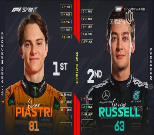 稍早结束的冲刺排位赛上,几位还处在争冠行列的车手中,皮亚斯特里获得杆位,诺里斯第三发车,维斯塔潘仅仅排在第6位。