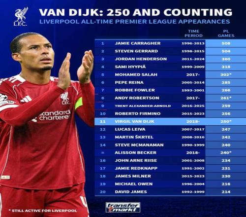 北京时间12月14日,在英超第16轮利物浦主场2-0击败布莱顿的比赛中,红军队长范戴克迎来了自己代表俱乐部在英超出场250场比赛的里程碑,与此同时,德转也列出了利物浦队史英超出场数排名前20位的球员。
