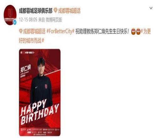 昨天是徐正源的55岁生日,成都蓉城官方并未在社交媒体为主帅送上祝福,而此前在15日,成都蓉城官方曾为助教郑仁焕送上生日祝福。