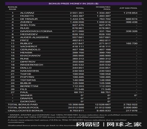 每缺席一站1000大师赛,球员的奖金就会被削减25%;即便缺席原因是受伤或退赛,这一规定同样适用,这项政策对阿尔卡拉斯的最终收入产生了重大影响。