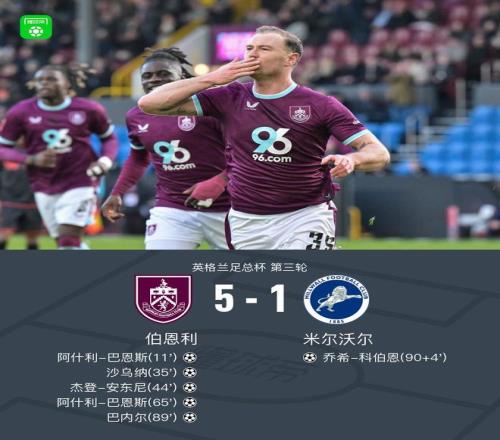 北京时间1月10日,英格兰足总杯第三轮展开较量,伯恩利迎战米尔沃尔。比赛伊始,布鲁恩-拉森送出助攻,阿什利-巴恩斯率先破门,为球队取得领先。随后埃克达尔精准传球,沙乌纳接球后攻门得手,进一步扩大优势。临近上半场结束,布鲁恩-拉森再次完成助攻,杰登-安东尼射门命中,将比分继续改写。易边再战,阿什利-巴恩斯把握机会再入一球,完成个人本场比赛第二次破门。之后巴内尔抓住战机,冷静施射建功,帮助球队巩固领先局面。比赛进入尾声阶段,rafiq lamptey送出关键传球,乔希-科伯恩推射得分,为对手追回一球。最终全场结束,伯恩利以5比1战胜米尔沃尔,顺利晋级下一轮。